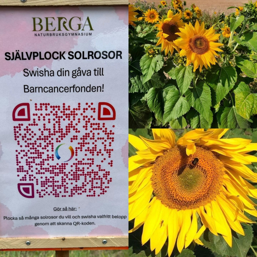 Kom och plocka så många solrosor du vill – och swisha valfritt belopp direkt till Barncancerfonden 💛.