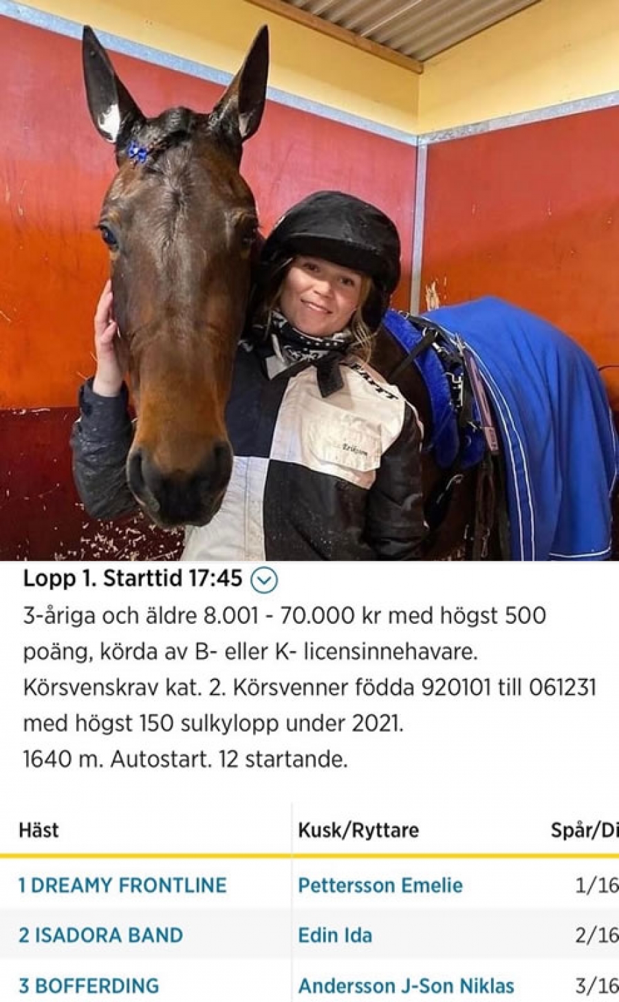 Idag 17 mars, startar Bergas travhäst Isadora Band med årskurs 3 eleven Ida Edin i sulkyn på Gävle.